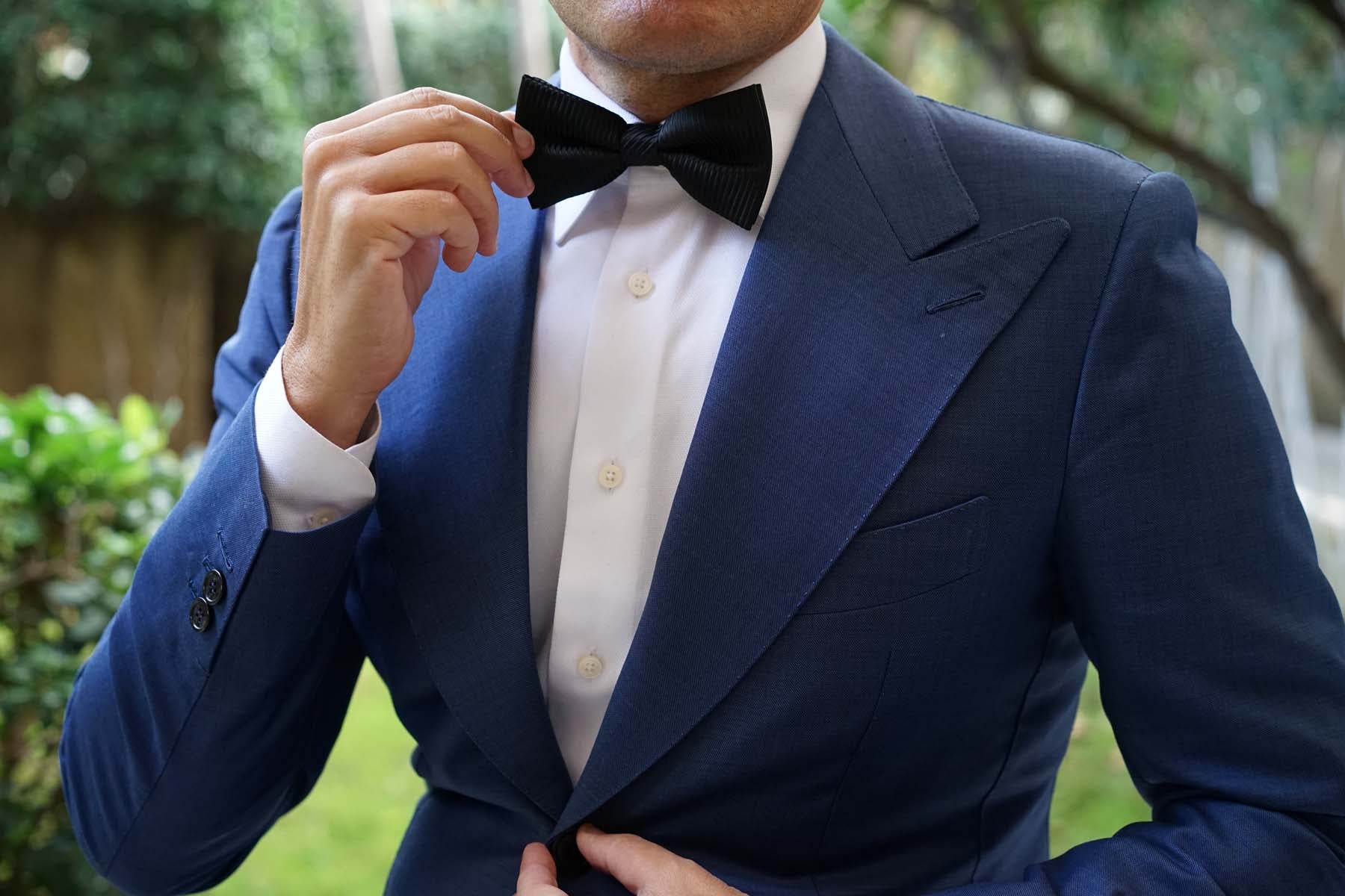 OTAA's Black Line Bow Tie injects personality to evening looks without compromising on sophistication. Expertly hand crafted, its lustrous threads create a tonal, striped pattern. Wear it with a satin lapel and a slim fit suit to ensure a sleek finish to complete your dapper ensemble.