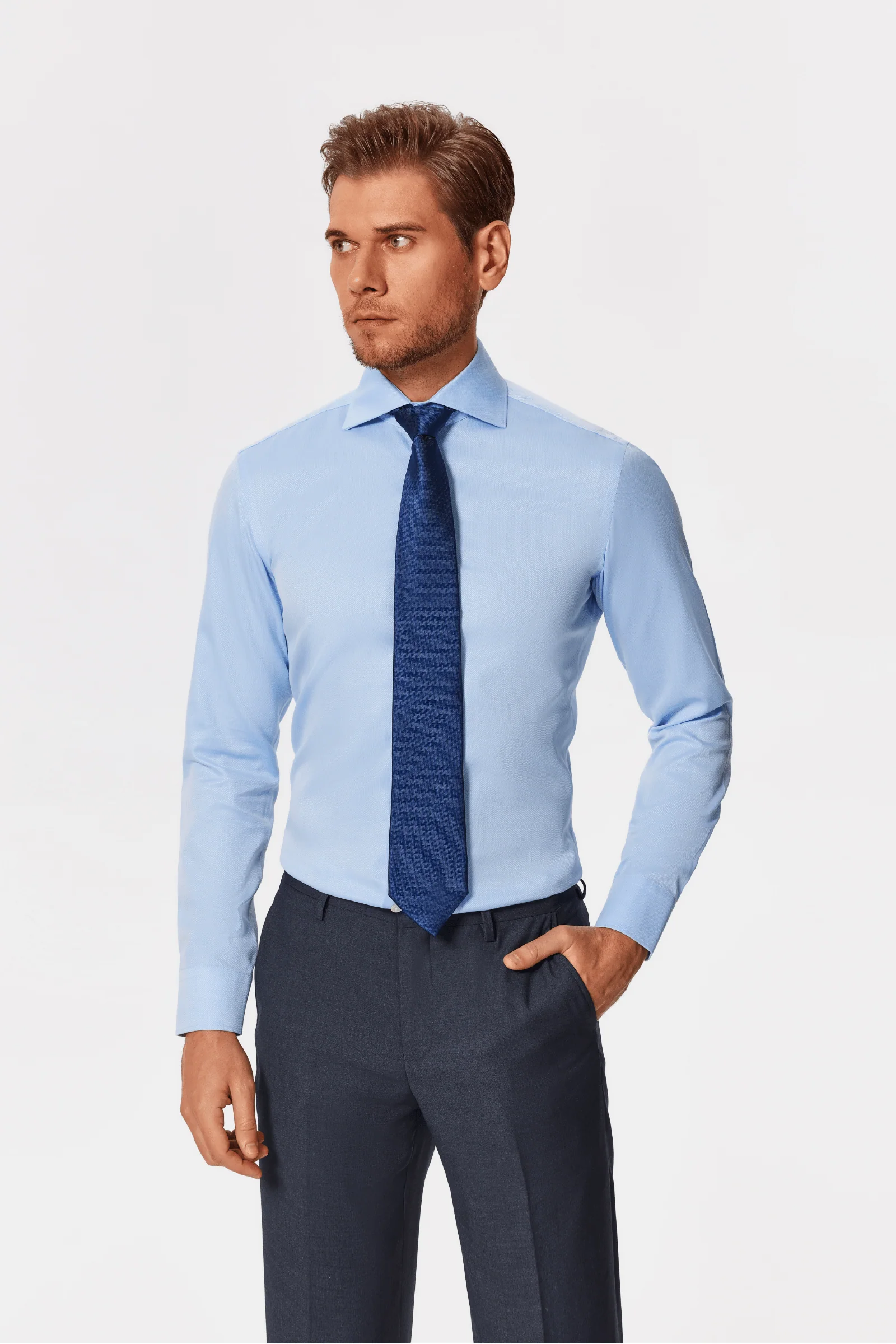 Introducing the refined Belfort Blue Lucious Non-Iron Shirt, designed to elevate your wardrobe with impeccable style and unmatched comfort. The high-thread-count dobby fabric ensures a smooth and luxurious feel against the skin, while the wrinkle-free finish keeps you looking sharp all day. Perfect for the modern professional, this shirt features an in-built soft collar stay that maintains its shape and adds a touch of sophistication to your ensemble. *Our Non-Iron shirts generally come out wrinkle-free when machine dried, though occasionally, depending on laundry conditions, a light ironing might be required.