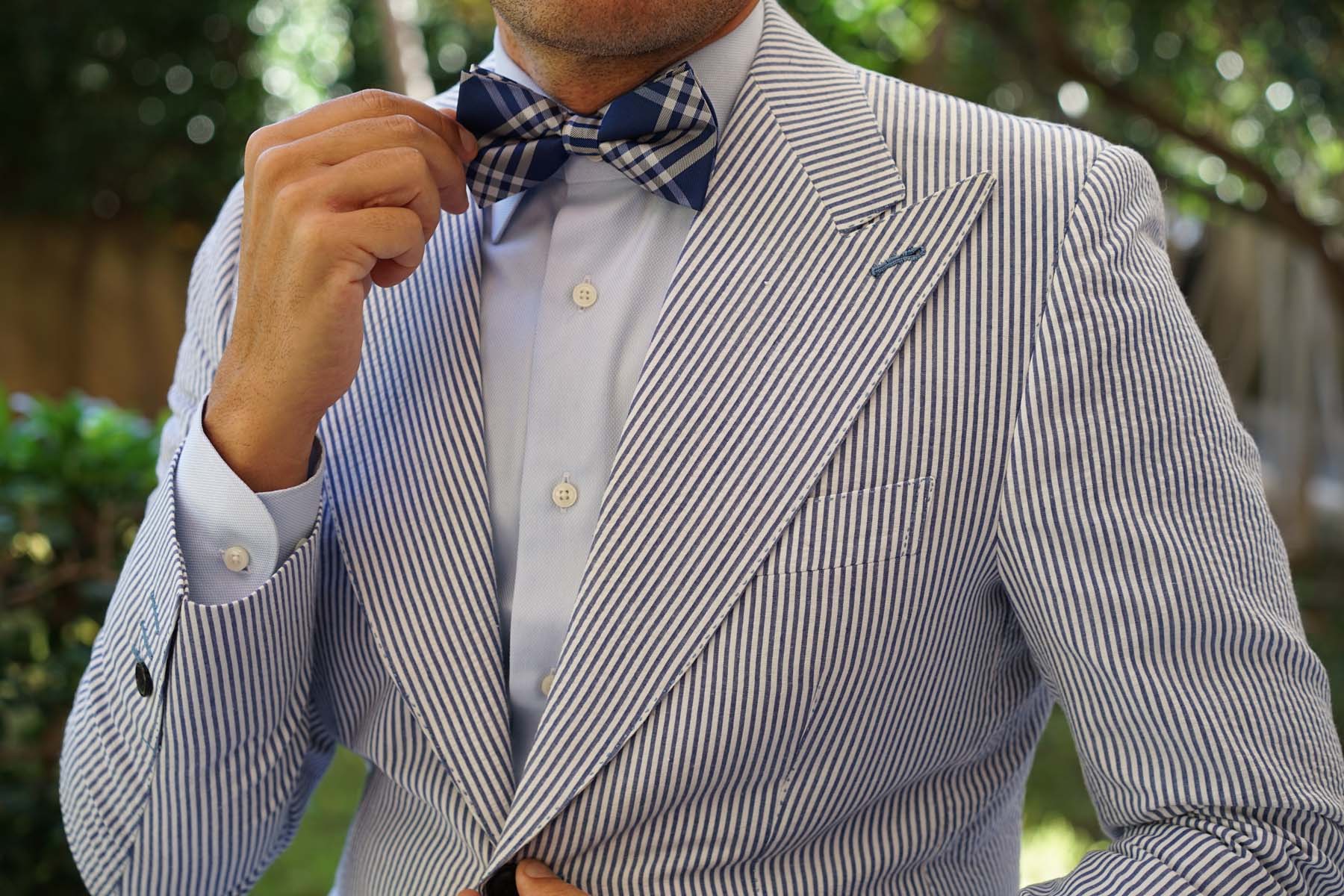 The striped and checkered cobalt blue Bow Tie displaying patterns of dark blue and white suits all functions, whether they’re formal or casual.