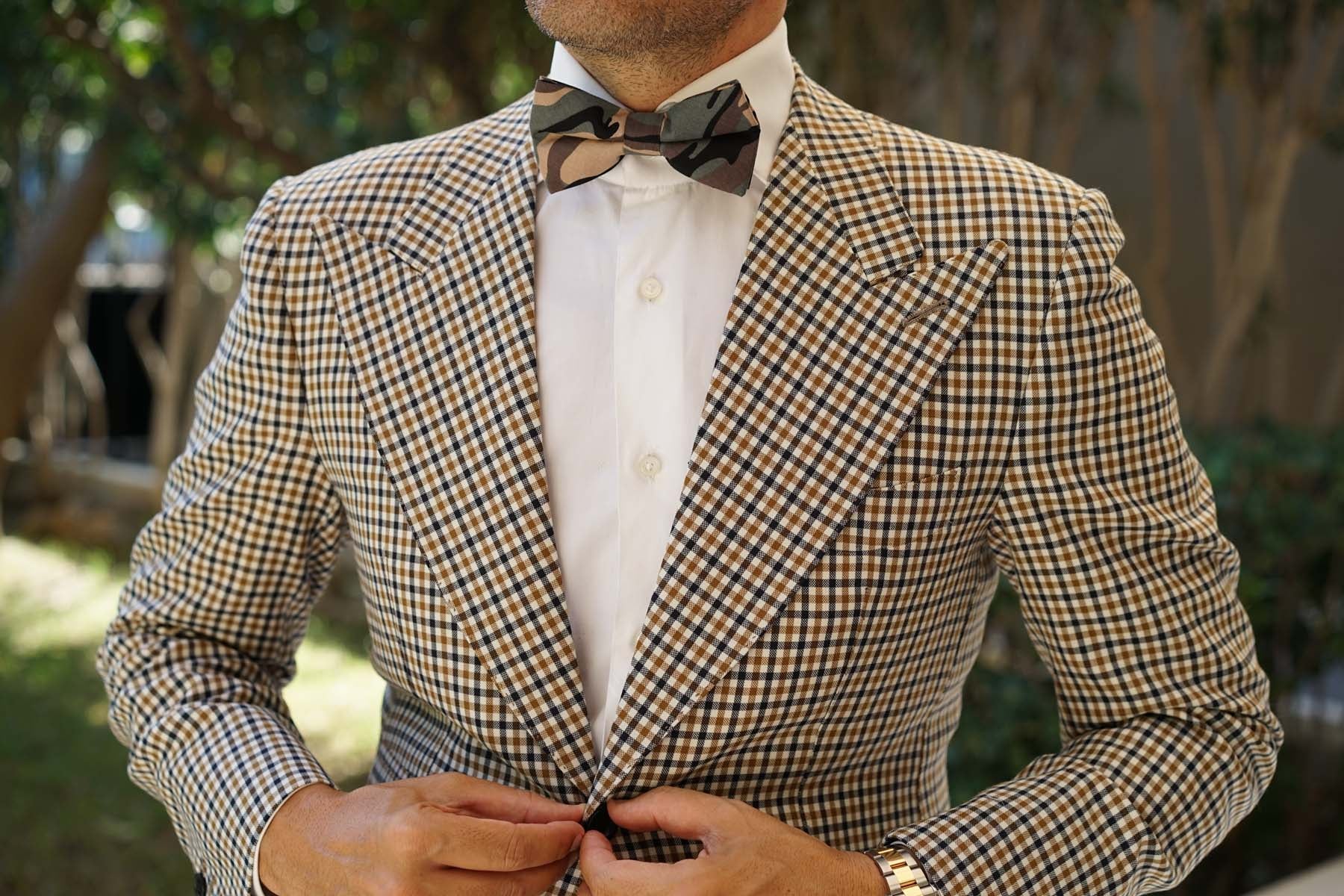 The Brothers at OTAA recently wore this Forest Green Camouflage Bow Tie on a hiking trip to the Amazon. They wanted to test if it could be used as a legitimate camouflage device. Soon upon arrival, they were pounced on by a vicious leopard and confronted by a local tribe who wanted to steal their designs. The brothers managed to escape with all their limbs intact; however it’s safe to say this Forest Green Camouflage Pre-tied Bowtie shouldn’t be worn as an actual camouflage device.