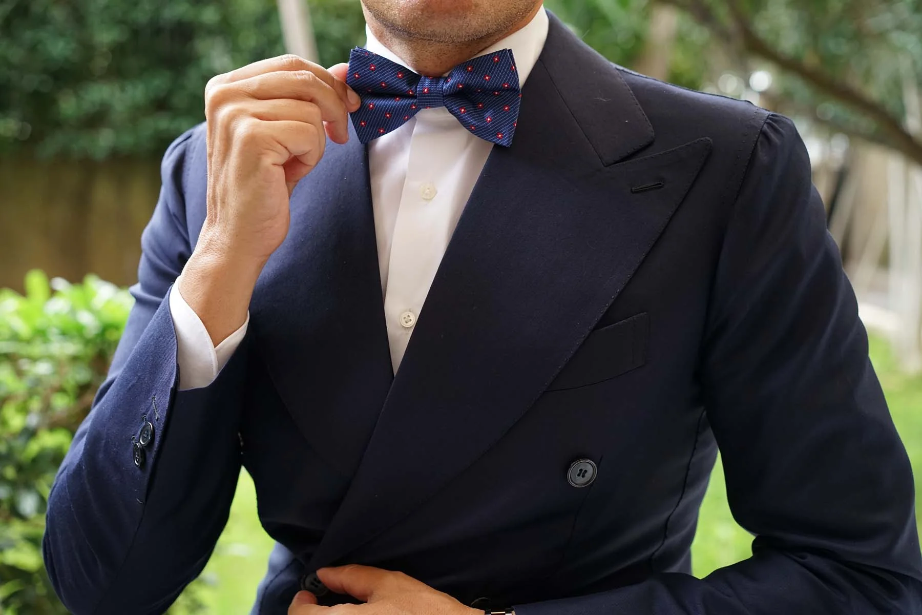 The Brothers at OTAA are specialists in handmade selections who maintain classic shapes and designs, but also create items that feel sublime to wear and impart a relaxed, insouciant air. This Navy Blue with Red Pattern Bow Tie has been tailored to our specific design brief for quality that you can be assured of and is ideal for weddings and other events.