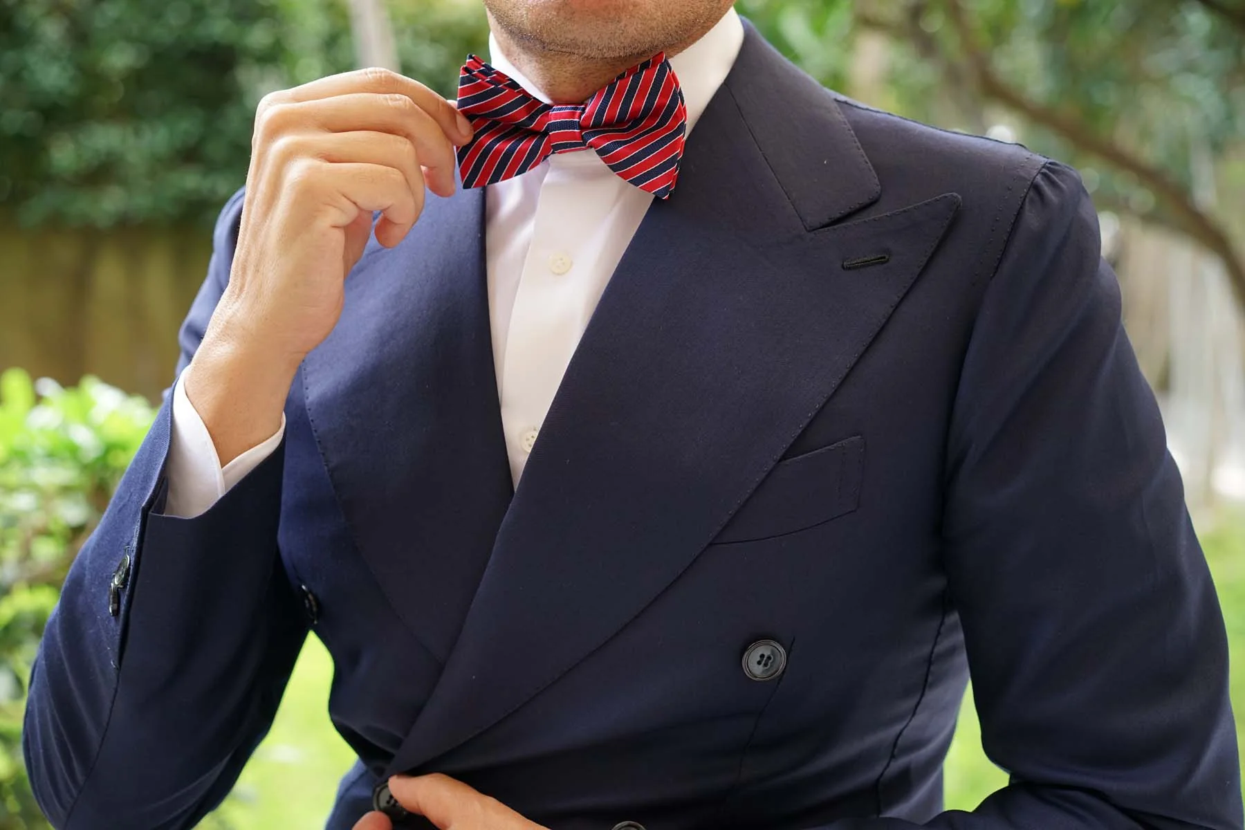 The Striped Maroon with Navy Blue Bow Tie is bold and perfect for formal and pre-tied bow tie events. This Bow Tie pattern complements the thin pre-tied bow tie style and would be best matched with our Navy Blue Pocket Square with Red Stripes